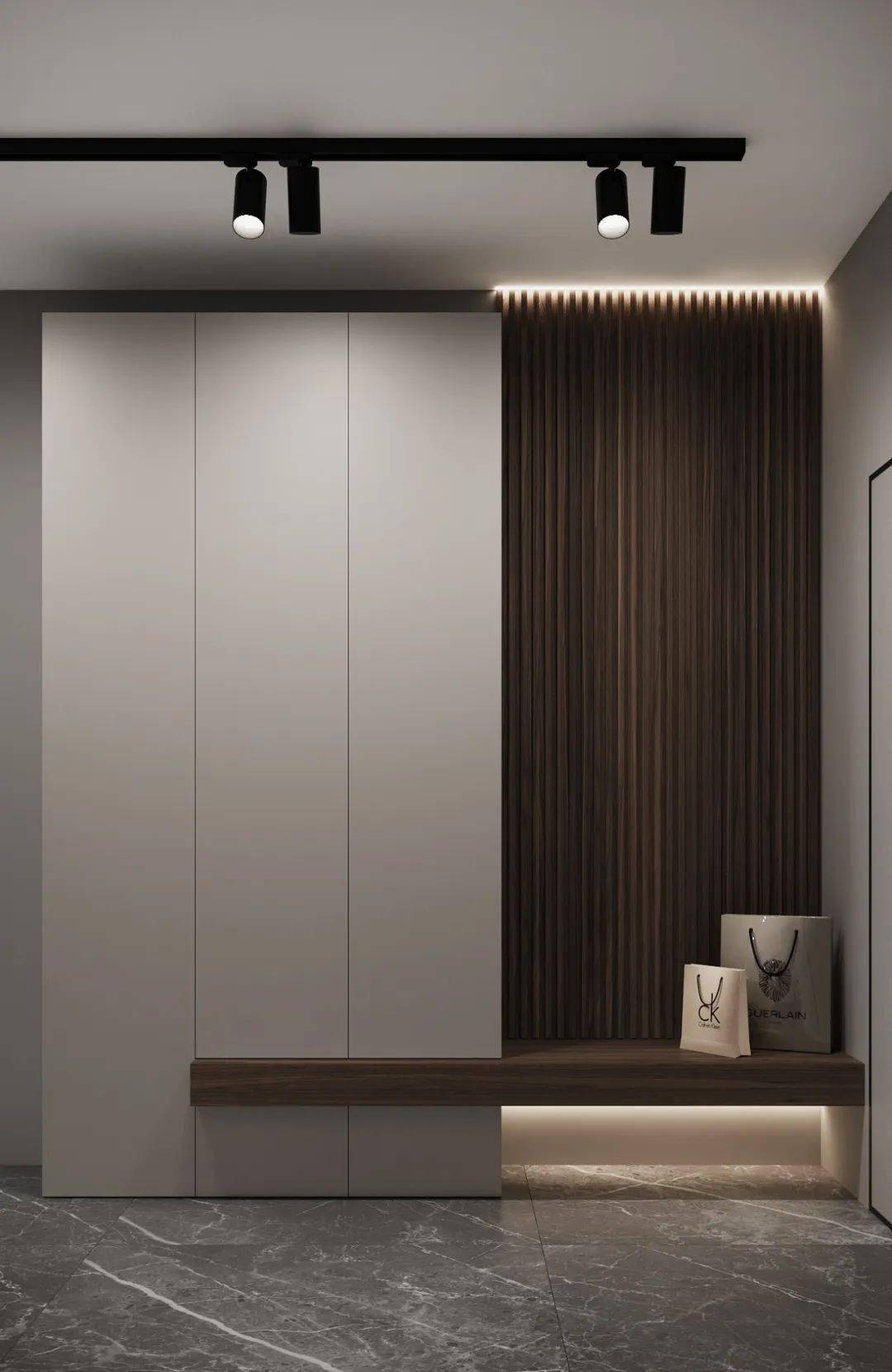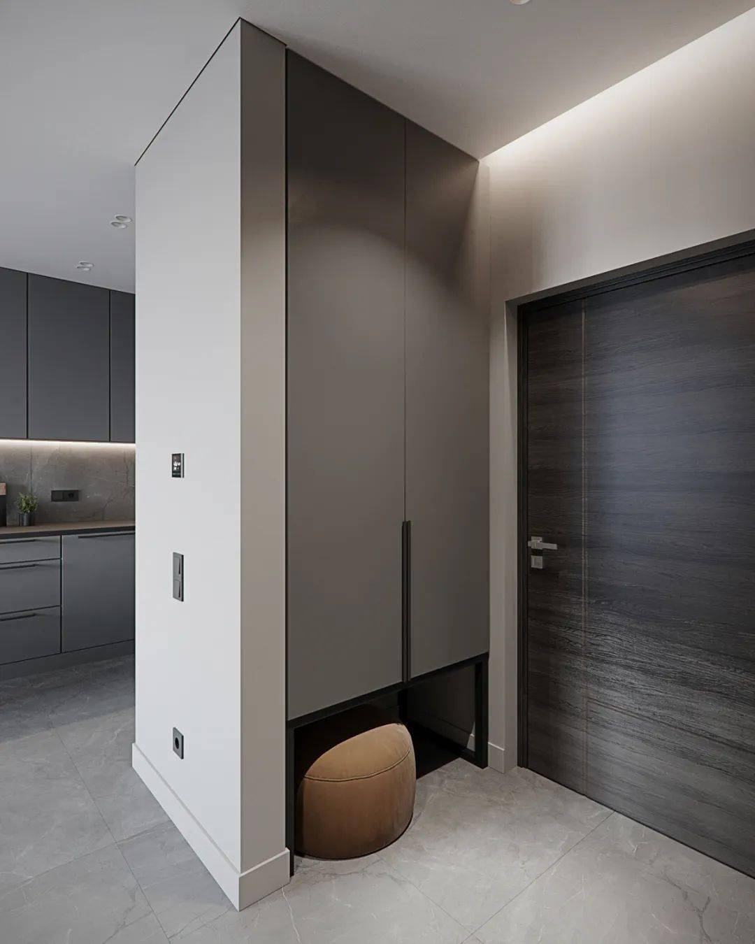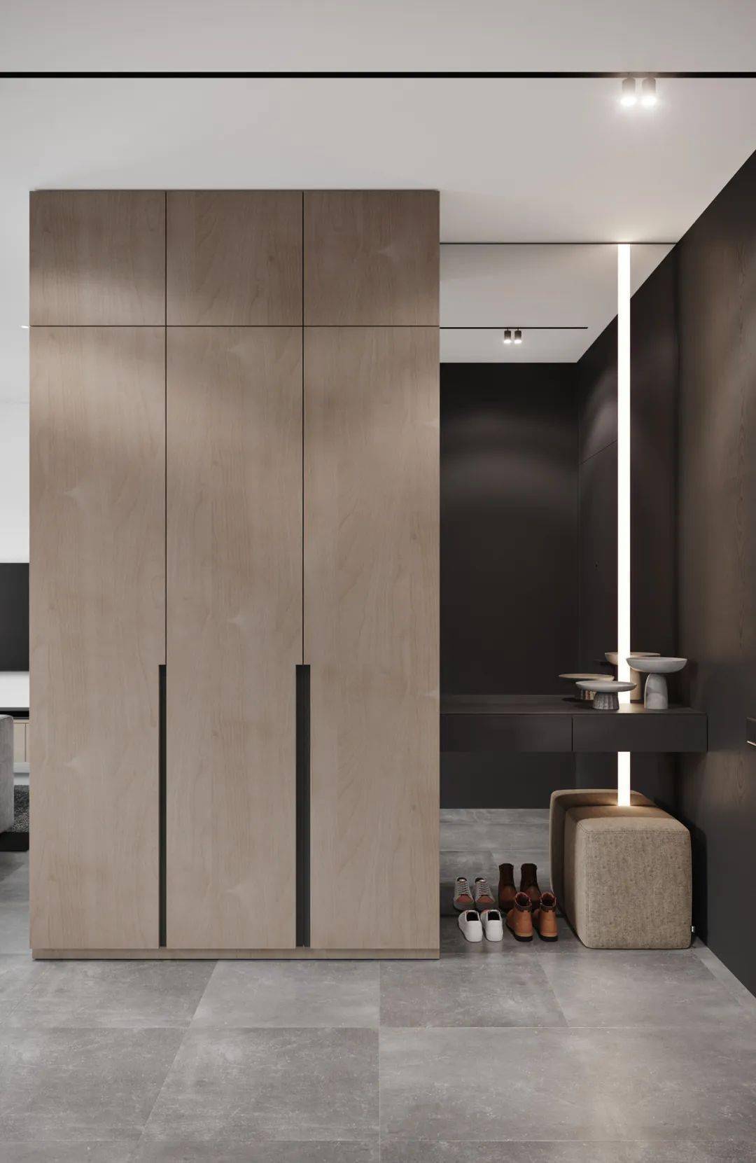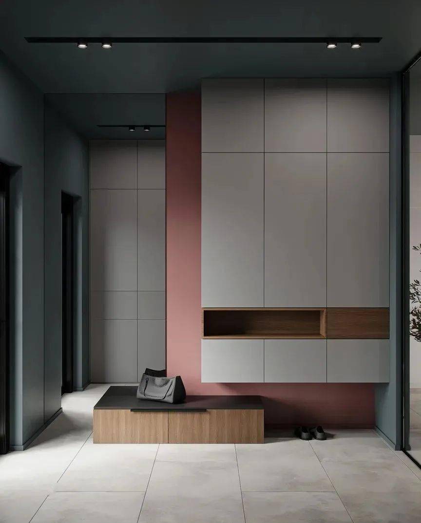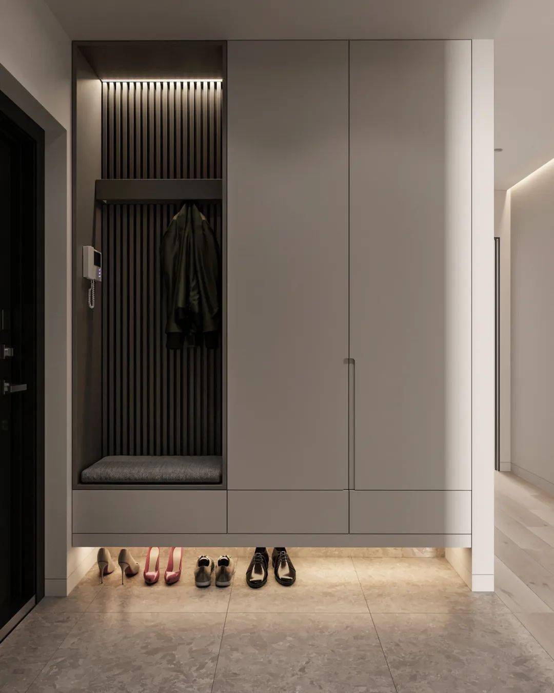 门厅柜的设计要考虑到空间的利用率,可以在门口安装一个嵌入式的衣帽架和鞋柜,在设计上让其与周边家具一体化,节省空间,增加收纳功能。