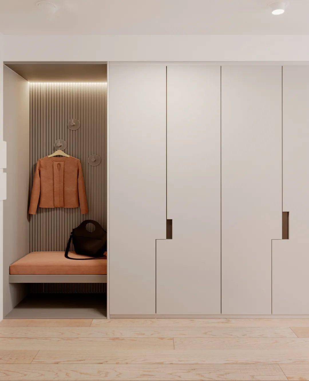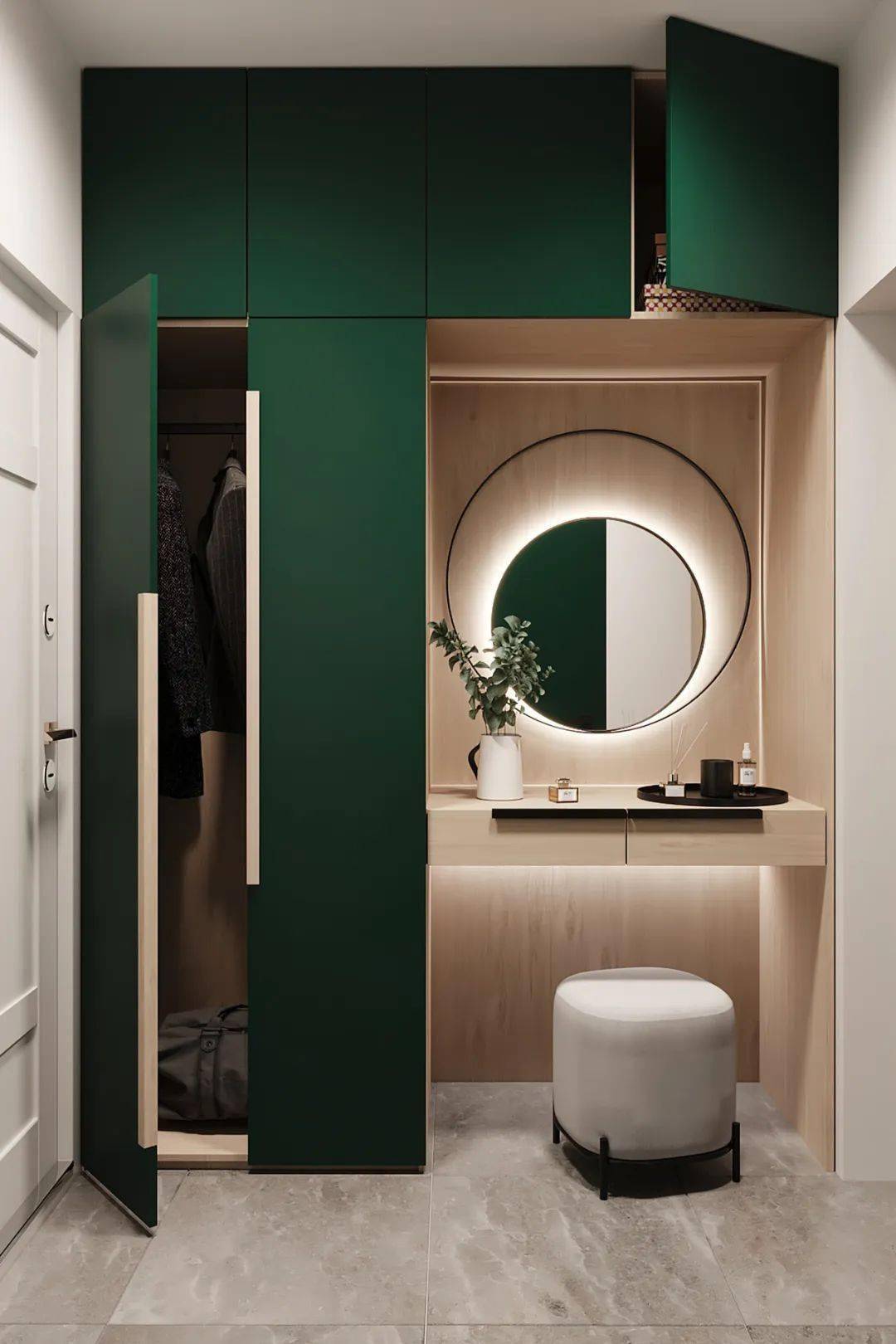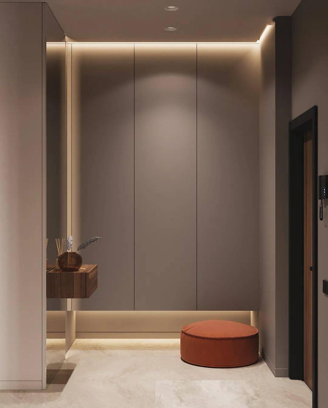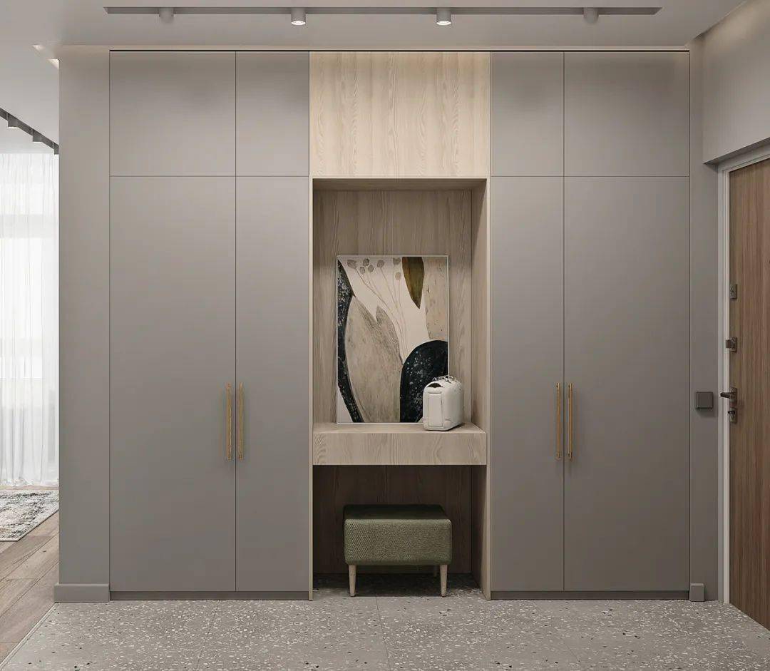 门厅柜的设计要考虑到空间的利用率,可以在门口安装一个嵌入式的衣帽架和鞋柜,在设计上让其与周边家具一体化,节省空间,增加收纳功能。