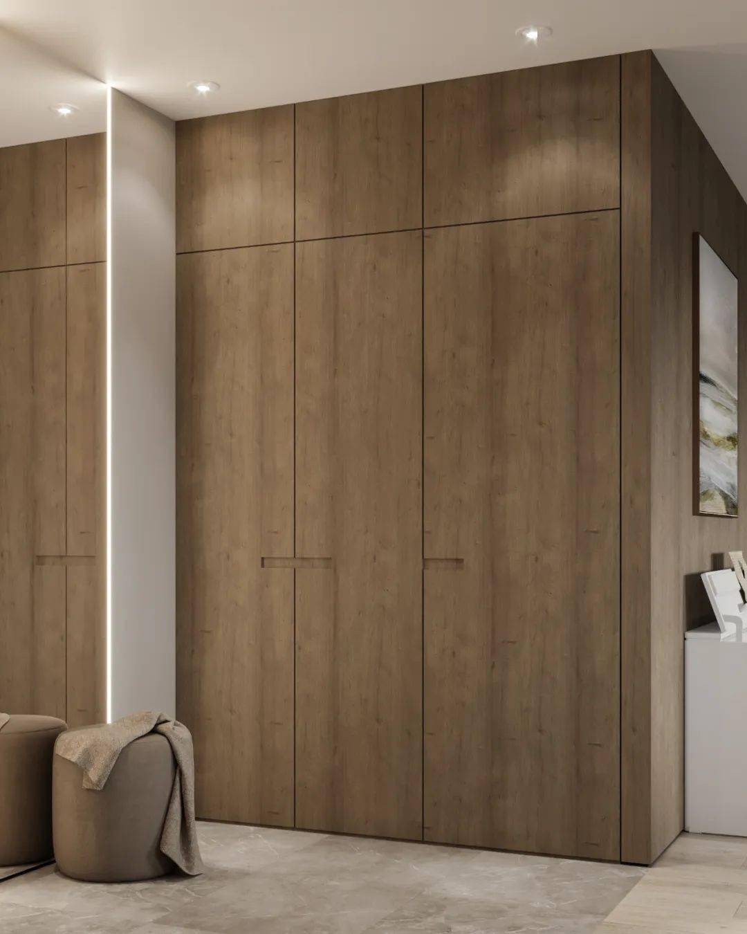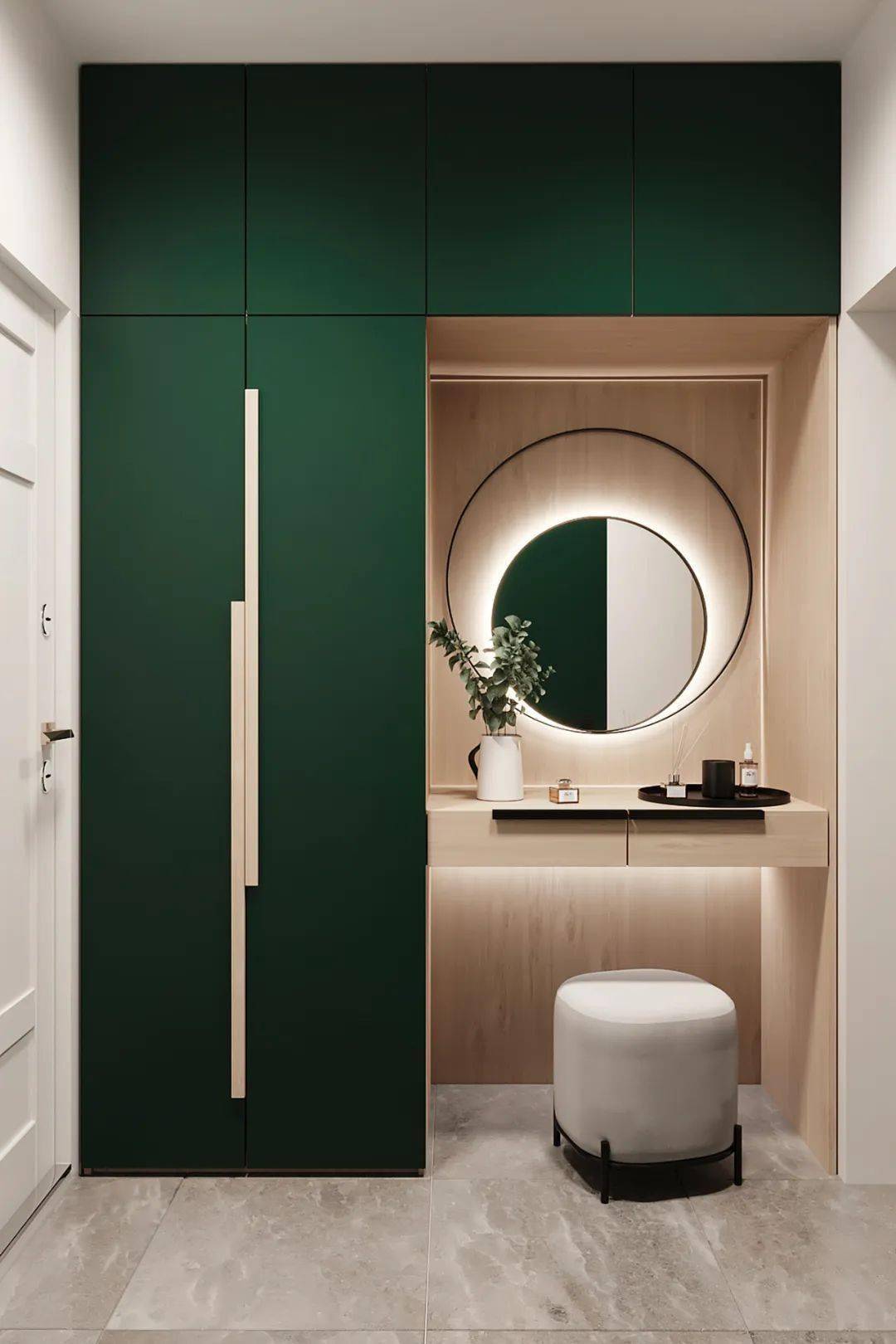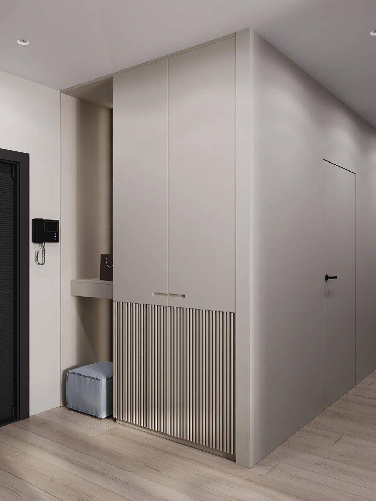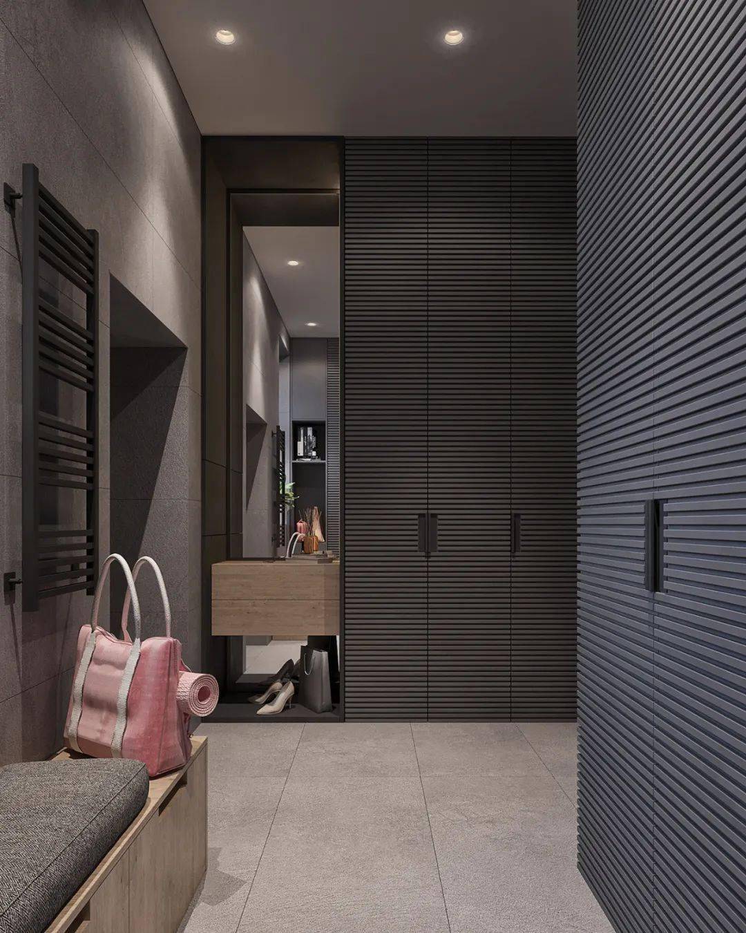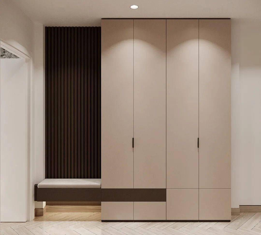 门厅柜的设计要考虑到空间的利用率,可以在门口安装一个嵌入式的衣帽架和鞋柜,在设计上让其与周边家具一体化,节省空间,增加收纳功能。