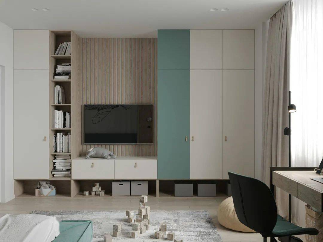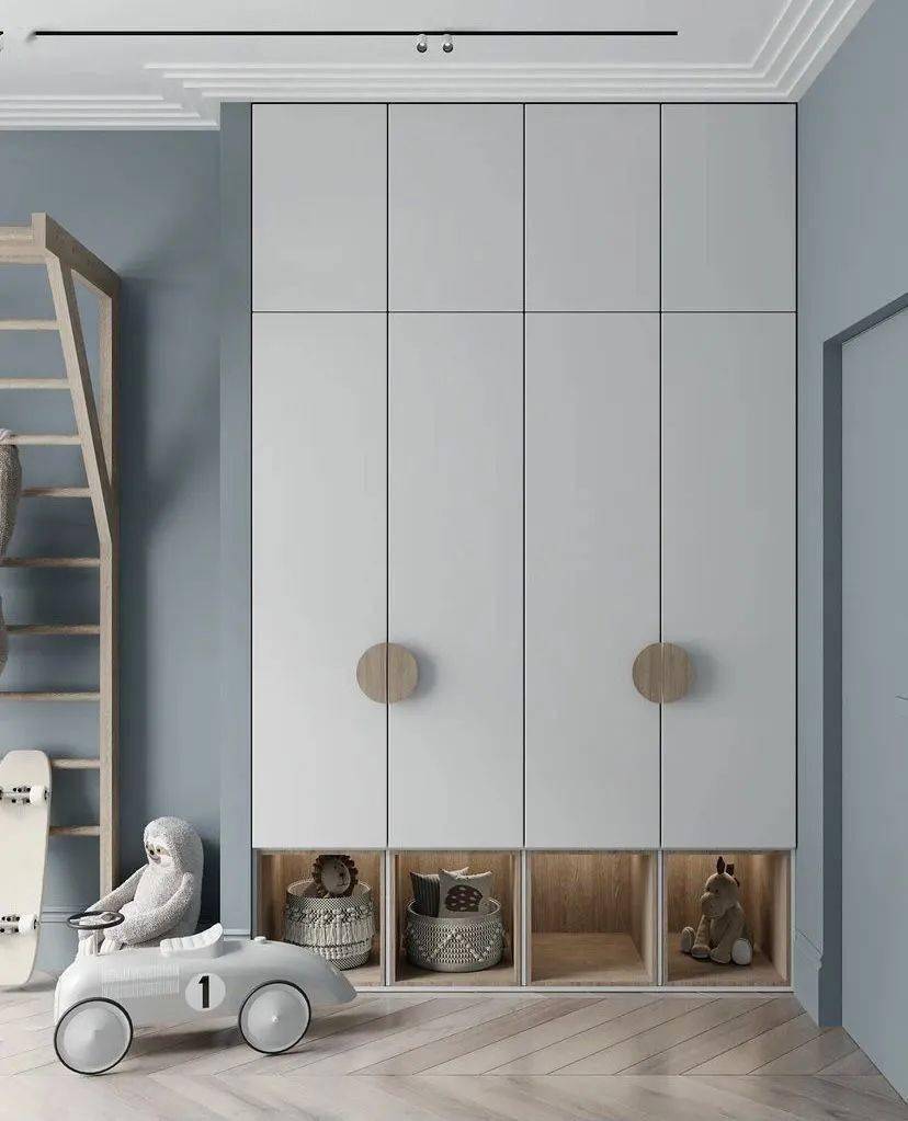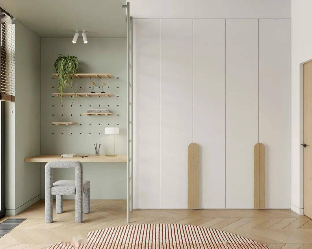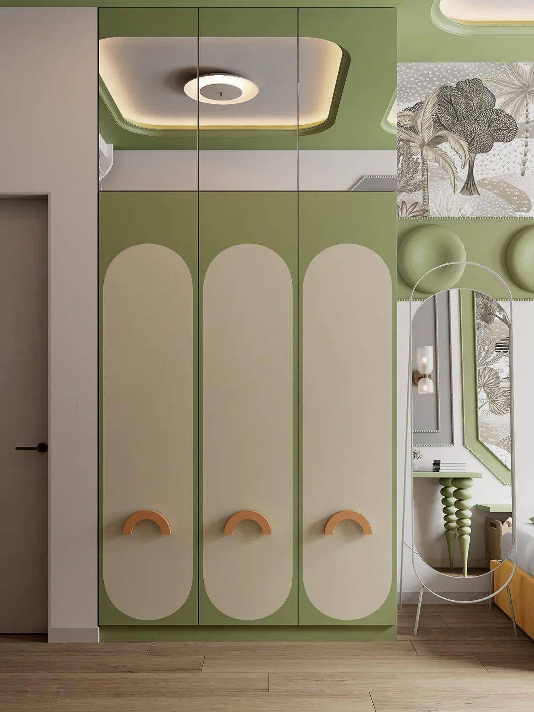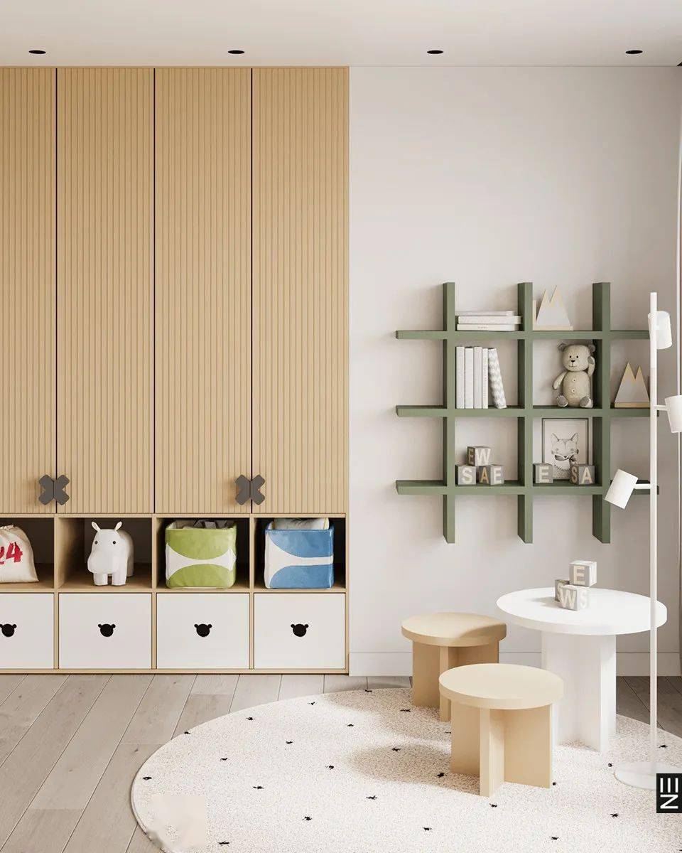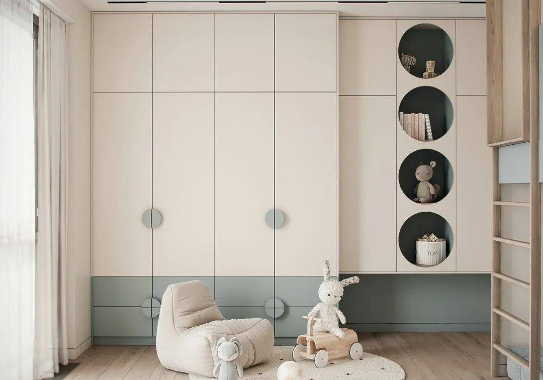 儿童房衣柜以亲和力十足的莫兰迪色系,内嵌墙柜以肤感的面板,搭配无把手设计,显示空间趣味,温馨且具个性。