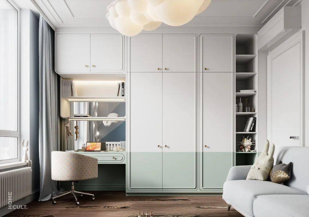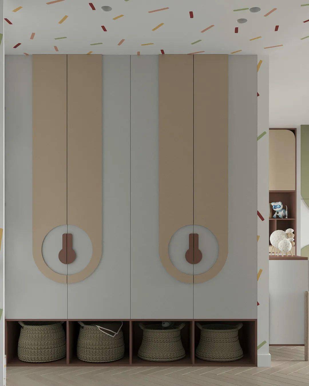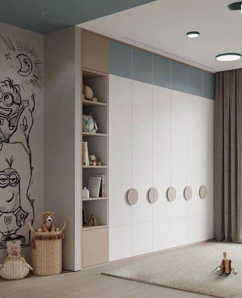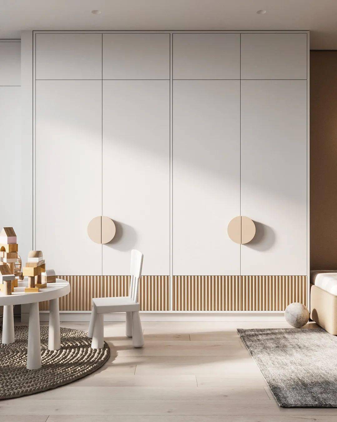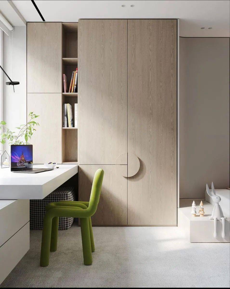 儿童房衣柜以亲和力十足的莫兰迪色系,内嵌墙柜以肤感的面板,搭配无把手设计,显示空间趣味,温馨且具个性。