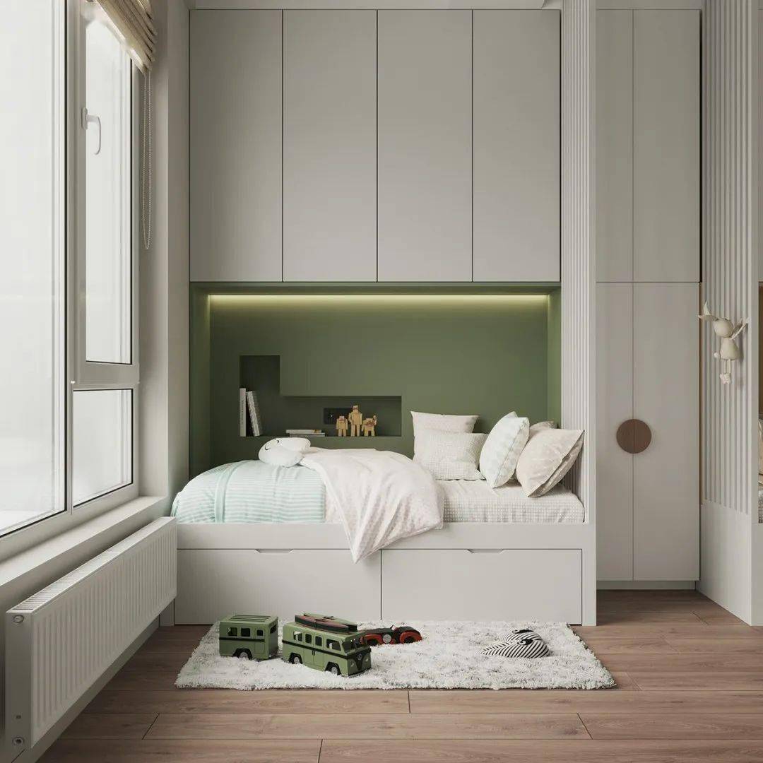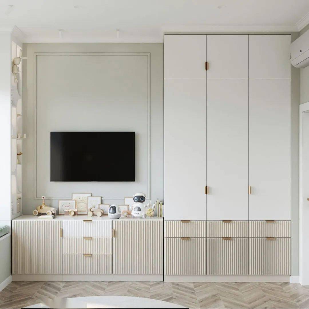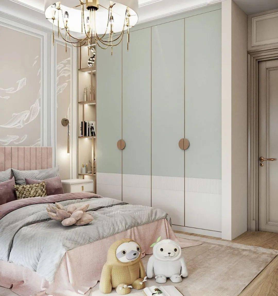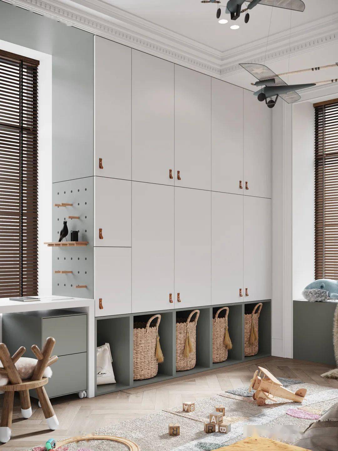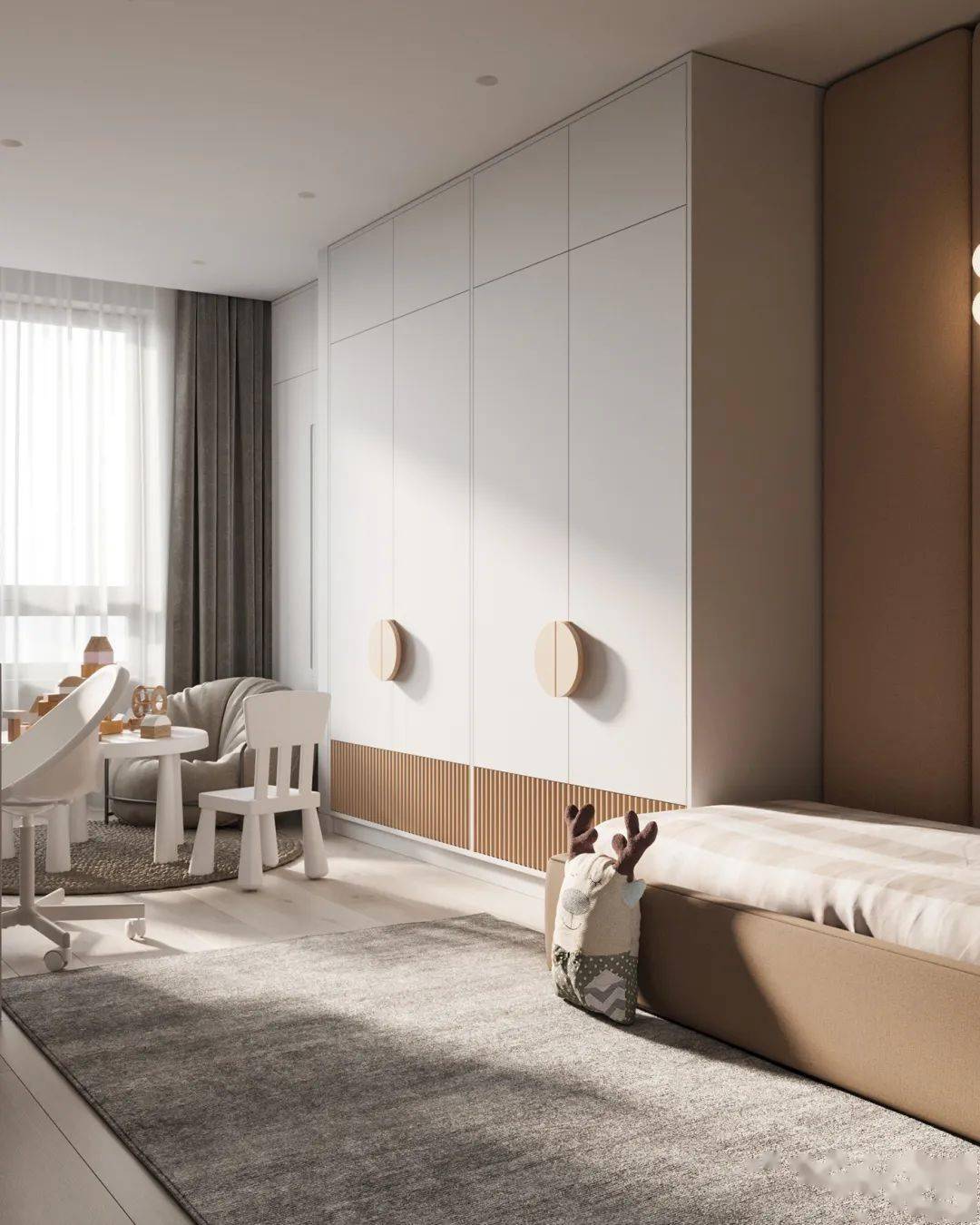 儿童房衣柜以亲和力十足的莫兰迪色系,内嵌墙柜以肤感的面板,搭配无把手设计,显示空间趣味,温馨且具个性。