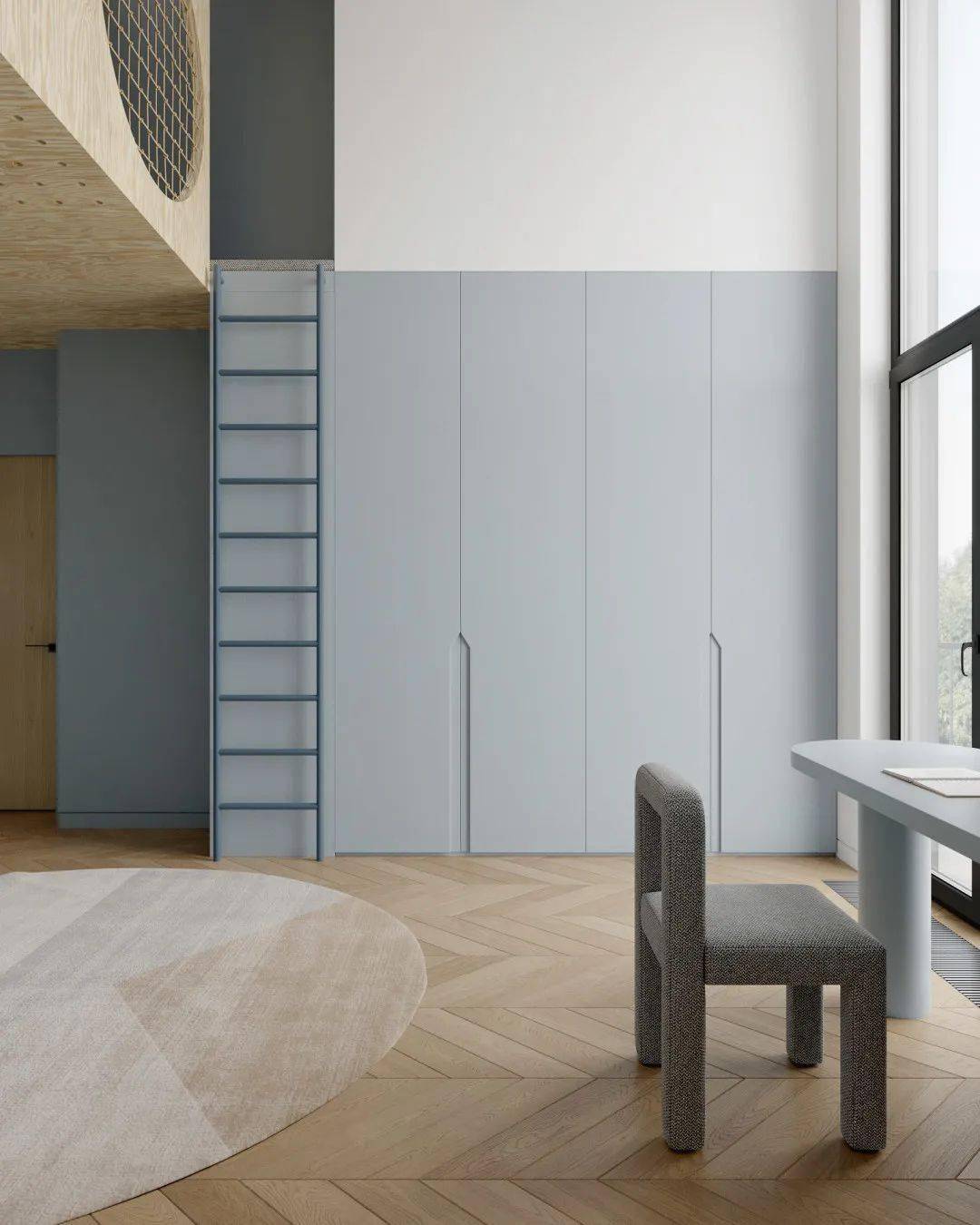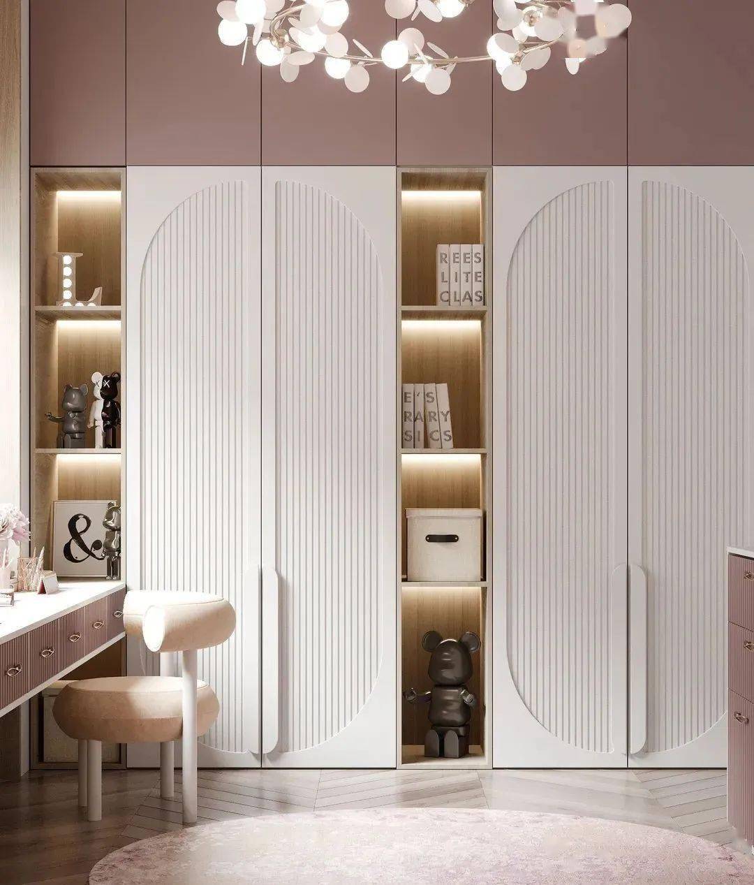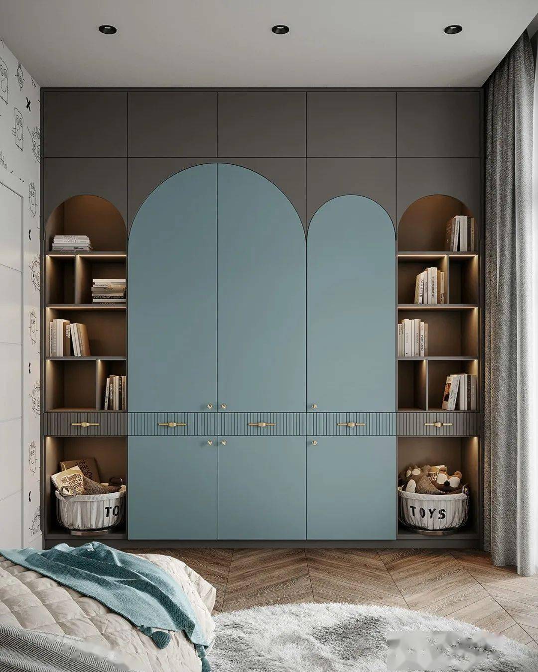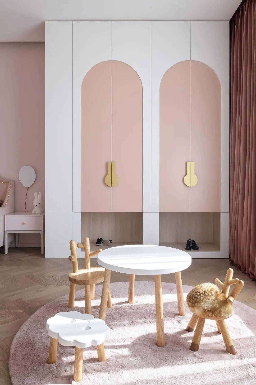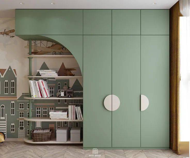 儿童房衣柜以亲和力十足的莫兰迪色系,内嵌墙柜以肤感的面板,搭配无把手设计,显示空间趣味,温馨且具个性。