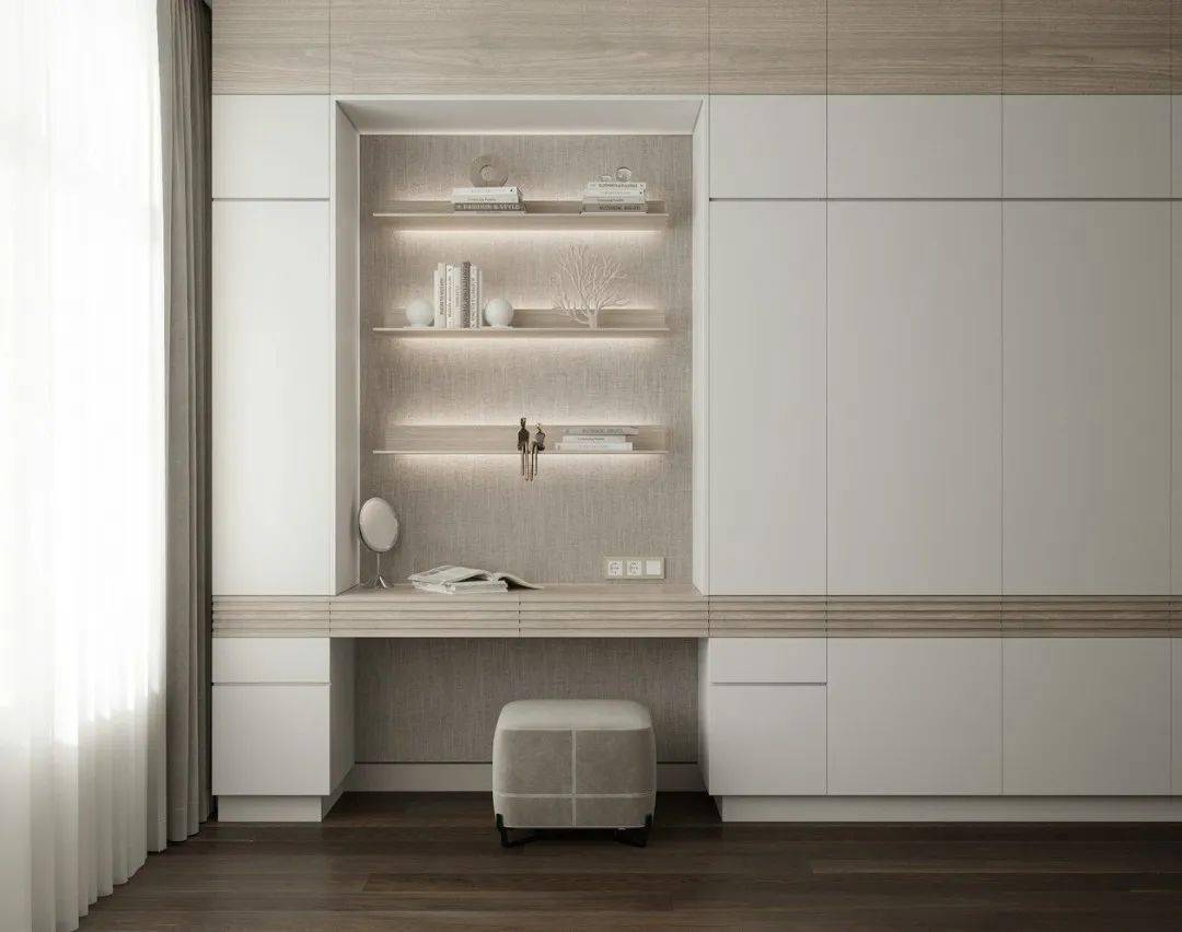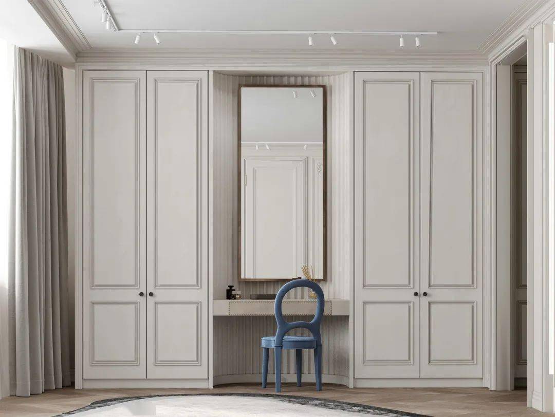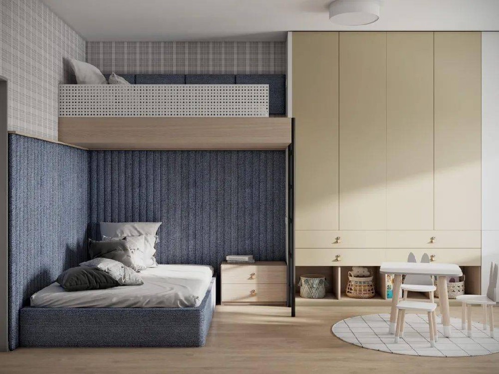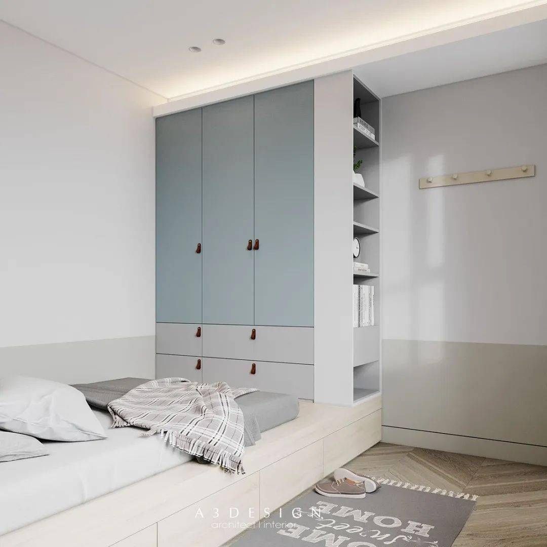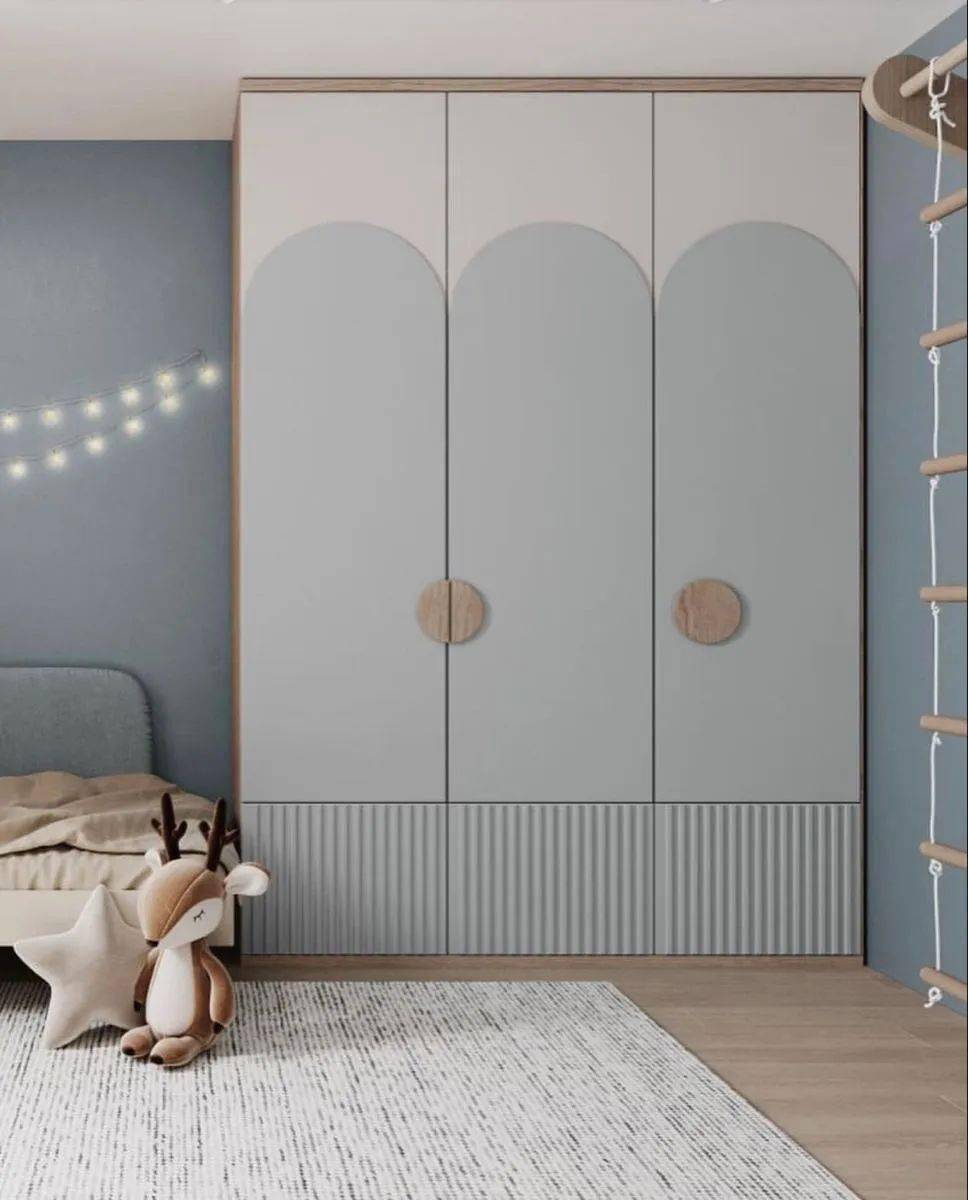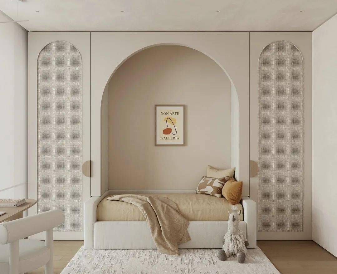 儿童房衣柜以亲和力十足的莫兰迪色系,内嵌墙柜以肤感的面板,搭配无把手设计,显示空间趣味,温馨且具个性。