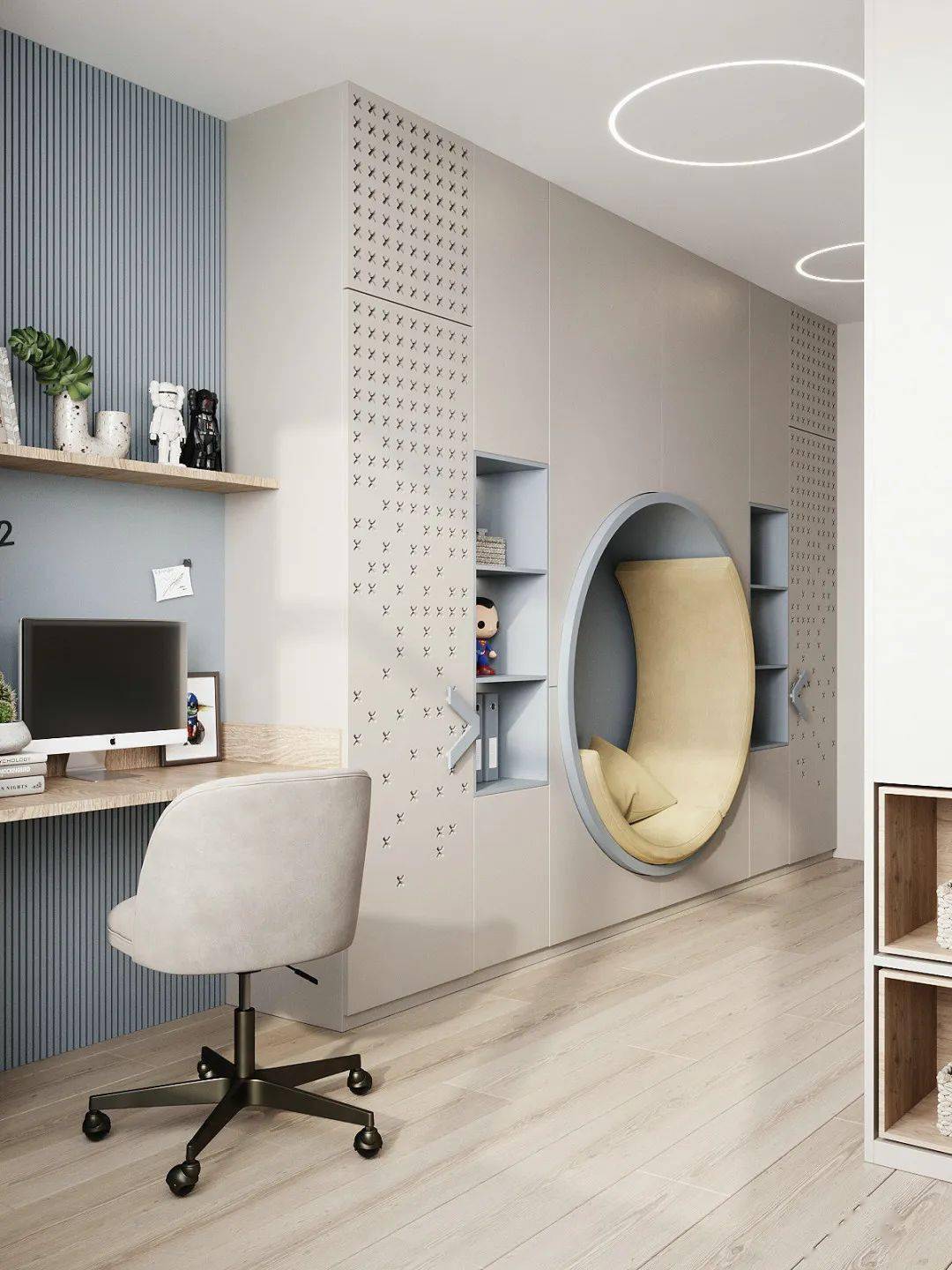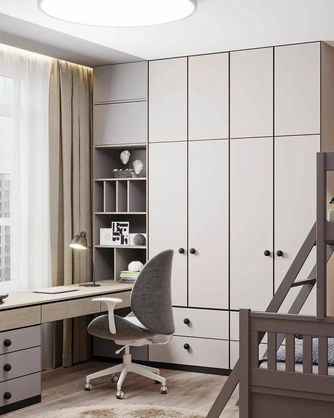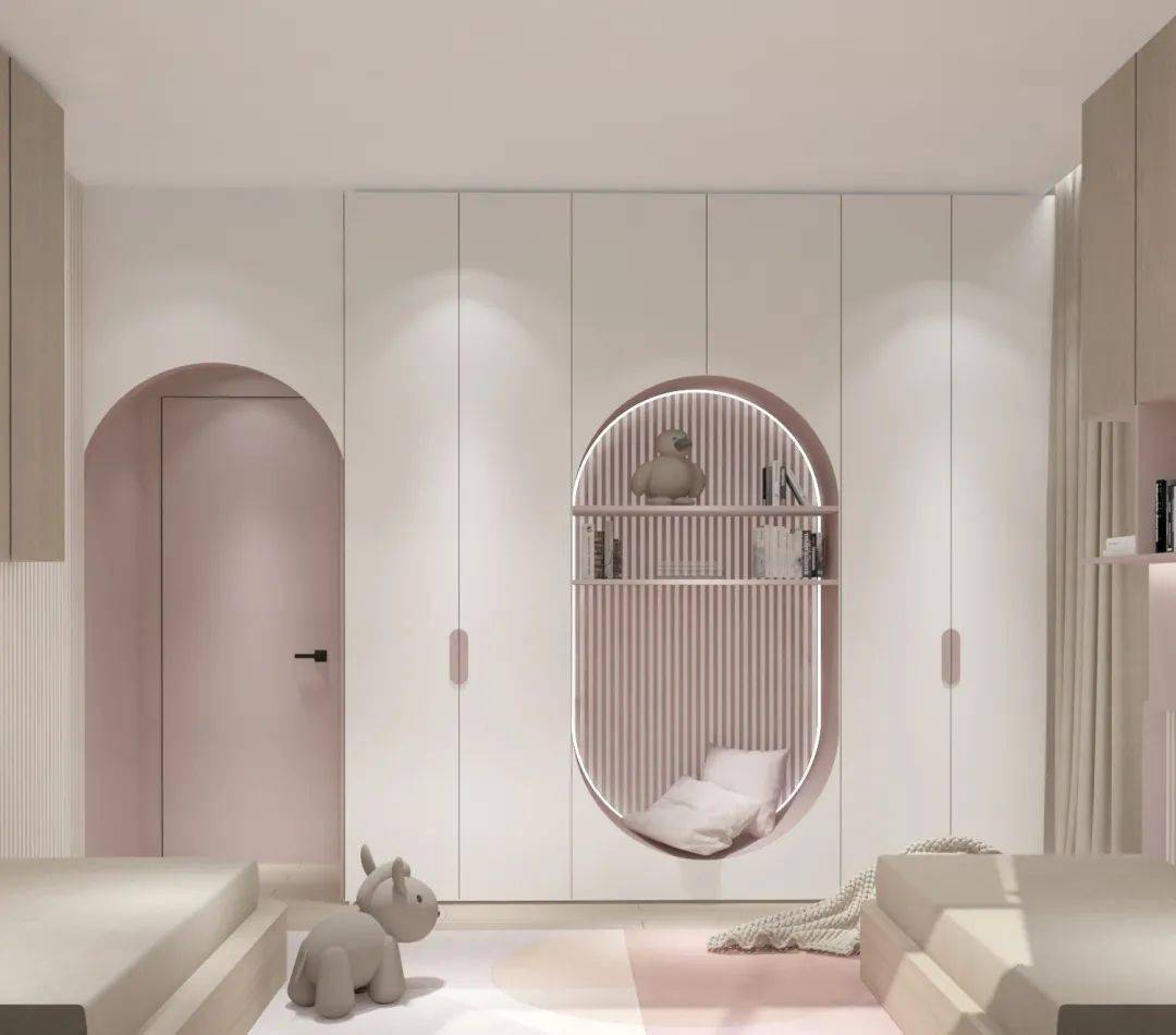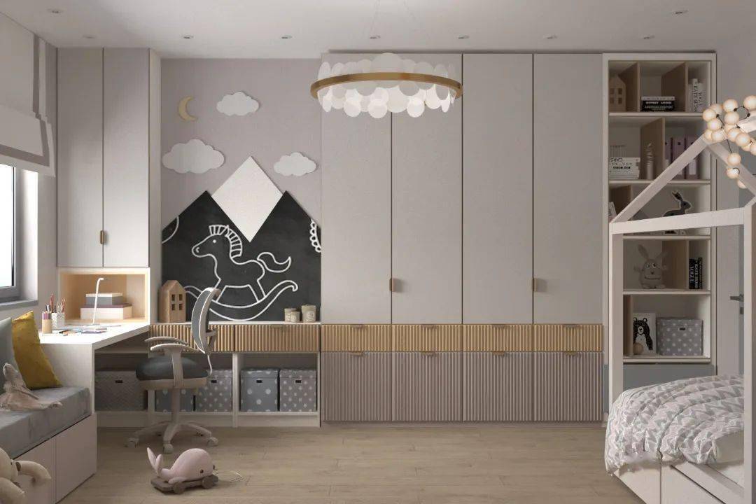 儿童房的设计,除了要营造一种天真烂漫的氛围外,还需要有休憩功能、学习功能和收纳功能。全屋定制的设计可以考虑将衣柜、书柜、书桌做一体化定制,不仅最大化利用空间的同时,而且满足多重需求。