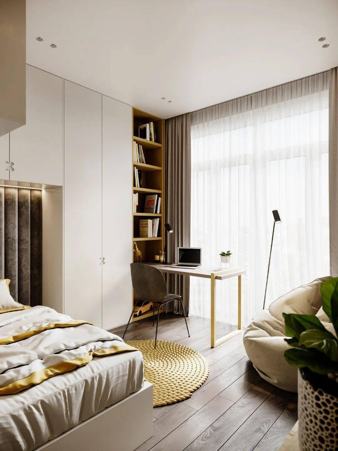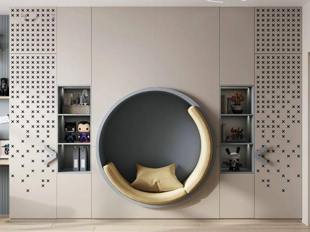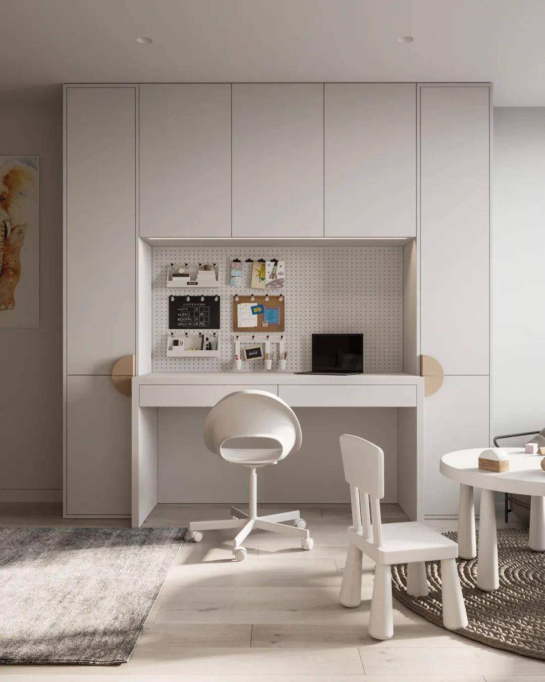儿童房的设计,除了要营造一种天真烂漫的氛围外,还需要有休憩功能、学习功能和收纳功能。全屋定制的设计可以考虑将衣柜、书柜、书桌做一体化定制,不仅最大化利用空间的同时,而且满足多重需求。