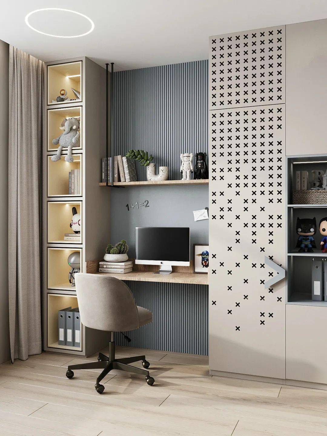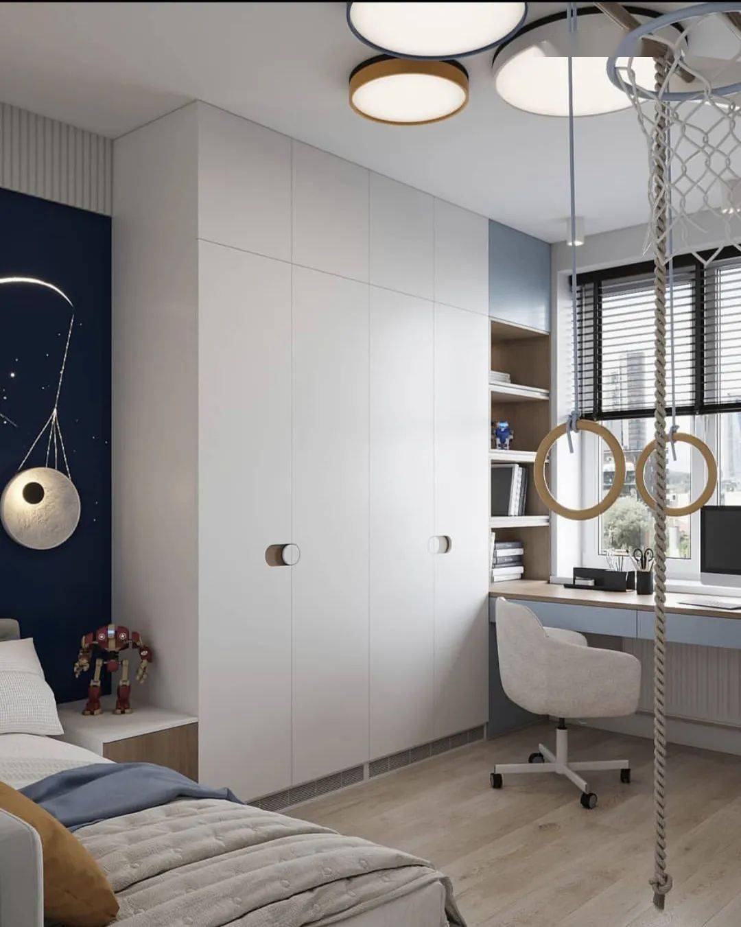 男孩房的衣柜,用来收纳各种衣物,加入一些纯净的蓝灰色、浅黄色,营造酷帅而又不失活力的空间氛围。开放柜可以放些卡通玩具做装饰,桌上摆放一些孩子喜欢的玩具或文具。